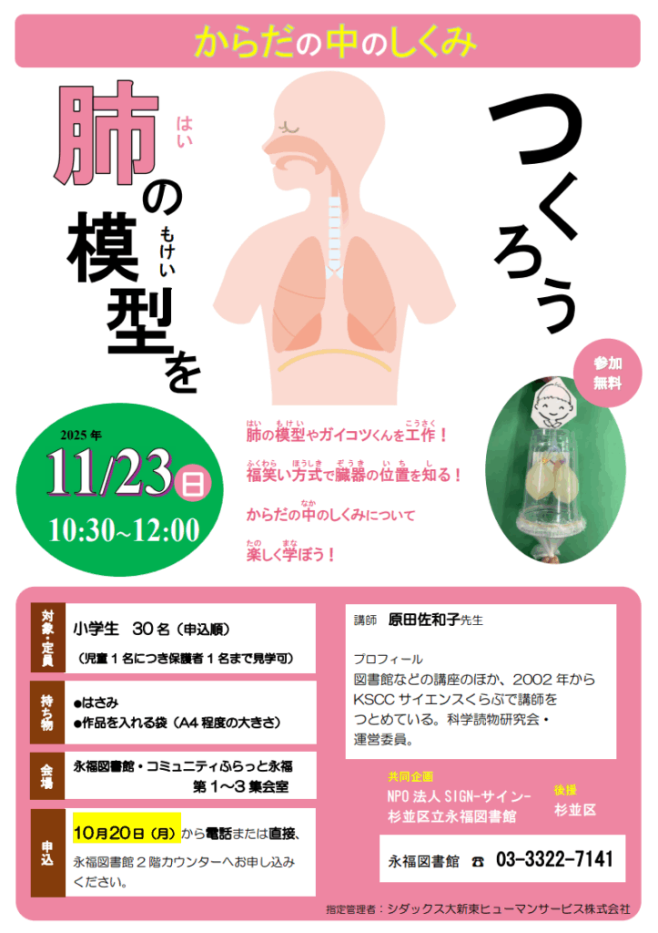 【2025年11月23日】NPO法人SIGN-サイン‐・永福図書館 共同企画 からだの中のしくみ 肺の模型をつくろう