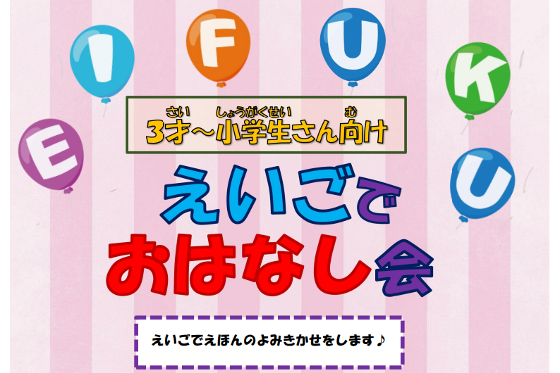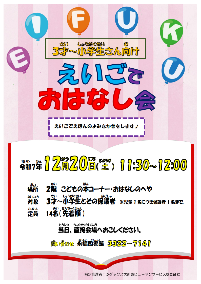 【2025年12月20日】3才~小学生向け えいごでおはなし会 2025年11月29日 図書館 英語で、絵本の読み聞かせや歌を楽しみましょう。 日時: 12月20日(土曜日) 午前11時30分から正午 会場: 2階 こどもの本コーナー・おはなしのへや対象: 3才から小学生とその保護者。定員: 14名(先着順) 児童1名につき、保護者1名まで同伴できます。 申込: 当日、直接会場へおこしください。 問合せ先: 永福図書館(永福3-51-17 電話03-3322-7141) PDF(1820KB) Share: Older Post 【2025年12月7日】ベルシスターズのはじまるはじまるクリスマス!