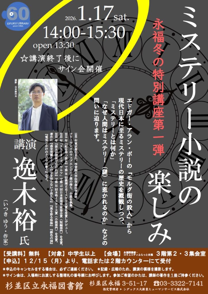 【2026年1月17日】永福冬の特別講座第1弾 作家・逸木裕氏講演会「ミステリー小説の楽しみ」