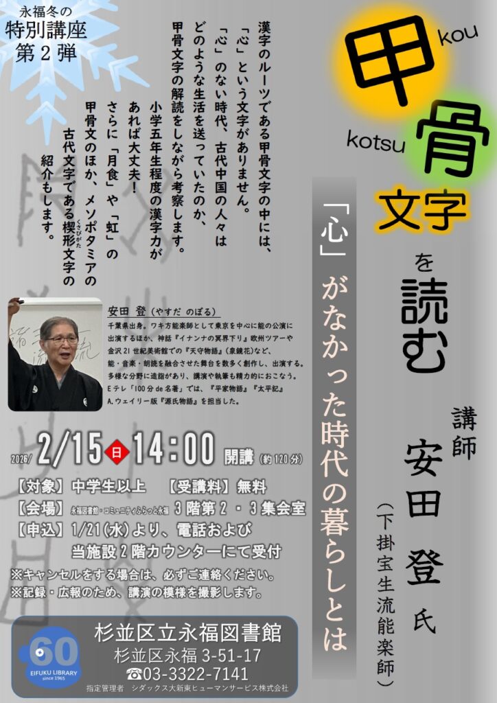 【2026年2月15日】永福冬の特別講座第2弾『甲骨文字を読む 「心」がなかった時代の暮らしとは』