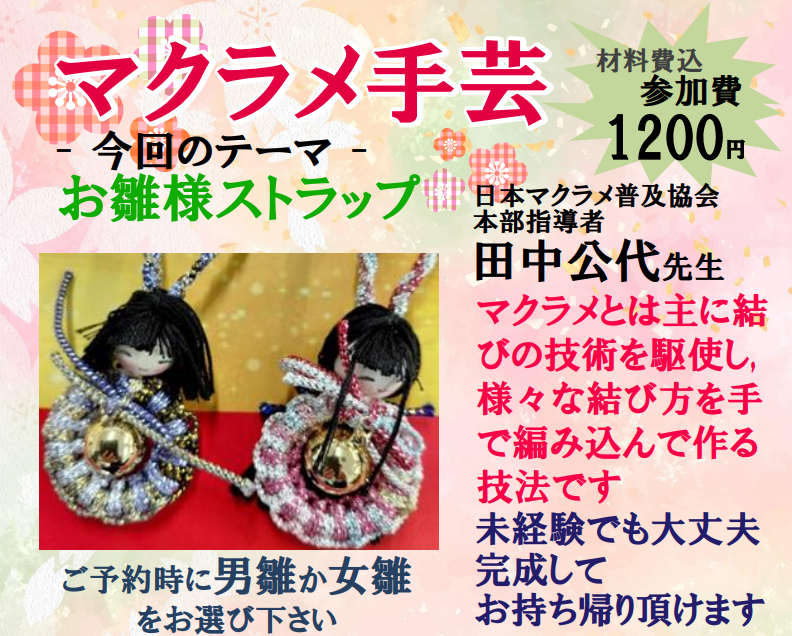 「マクラメ」とは色違いの紐を編み込んで装飾や模様を作る技法です。簡単なリストバンドや根付け、ショルダーバッグ等も作る事が出来ます。初心者でも懇切丁寧に指導します。手先が器用でなくても大丈夫。自分で物を作り上げる喜び、身につける幸せを共感しましょう!!